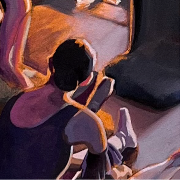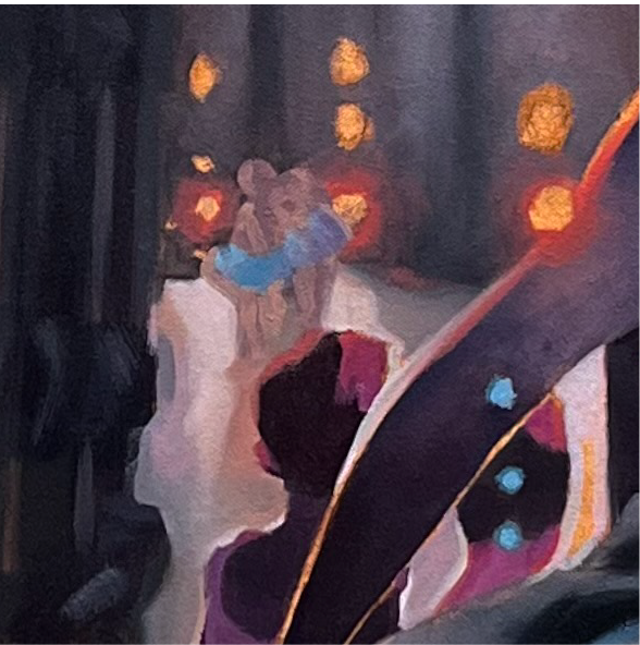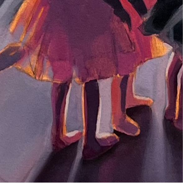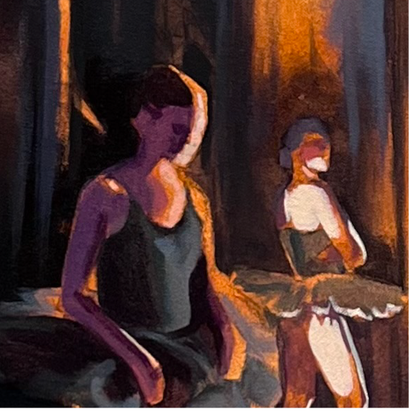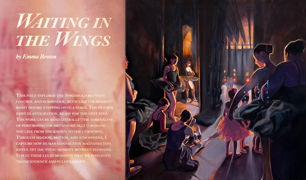 This piece explores the threshold between control and surrender, much like the moment right before stepping onto a stage. The figures exist in anticipation, ready for the next step. The work can be read literally (the adrenaline of performing) or metaphorically (crossing the line from the known to the unknown). Through shadow, motion, and atmosphere, I capture how human connection magnifies this joyful yet daunting moment between everyone. It is in these lucid moments that we find both transcendence and vulnerability.