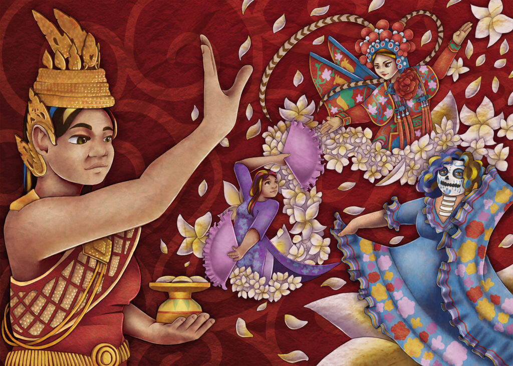 Our connection to these performances largely lies in our growing up interacting with these dances during important festivities—as the Clayton County area hosts a variety of cultures within its space. As children of immigrants, dance is one of the many ways we get to connect and experience our cultures authentically. The dances not only represent commemoration, blessing, and good luck, but they largely rely on women to carry on the tradition. In the case of Robam Jun Por and the Vietnamese Fan Dance, it is mainly women who perform them. While dances on Día de los Muertos can be performed by either gender, women have been at the forefront of representation in this art form. Meanwhile, women were outlawed for much of Chinese history from performing in Peking Opera. This changed during the 1930s, when actors were willing to take on female apprentices. This is symbolic of the female resilience in a male-dominated field, and the idea of the ‘Nan Dan’—a character archetype popular before the 1950s, where a man plays a female character so well he is indistinguishable from a woman, is also proof that even when women are outlawed from expressing themselves, they are necessary for the preservation of story and therefore, art.”